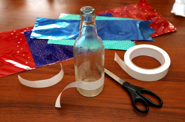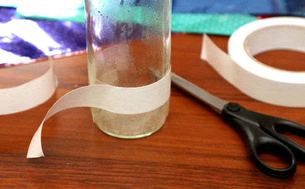 1. Nejdříve si lahvičku oblepte oboustrannou páskou tak, aby vždy kousek pásky přesahoval přes druhou. Odstraňte z pásky vrchní ochranný obal.