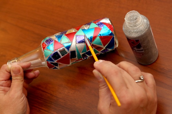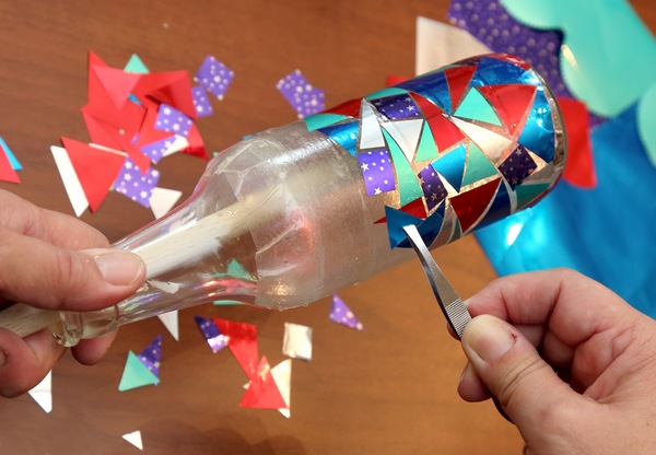 2. Z celofánových sáčků nastříhejte tvary (trojúhelníky, čtverečky…), které pinzetou skládejte na lahvičku, střídejte barvy. Využijte i rub, který bývá stříbrný. Tvary skládejte co nejblíž k sobě, ale když se vám to nepodaří, přetáhnete, nebo nedotáhnete, nic se neděje. Pokud zůstane otvor větší, vystřihněte podle něj další kousek. Ostatní se překryje ozdobnou spárou.