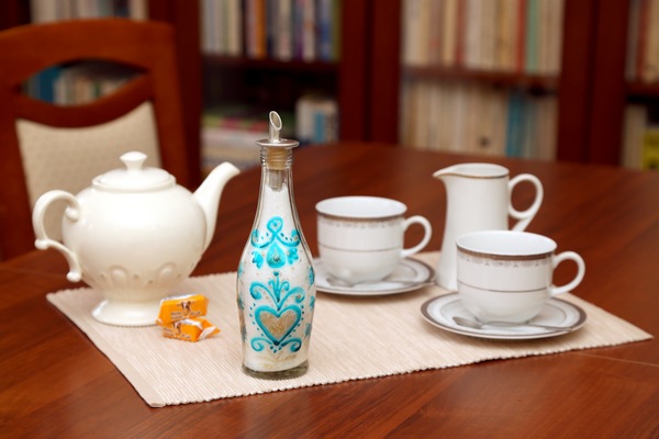 2. Nebo si obrázek nakreslete barvou na sklo a vybarvěte třpytivým glitrovým lepidlem. Do této lahvičky jsme dali sypký cukr a lahvička se rázem proměnila v užitečného pomocníka.