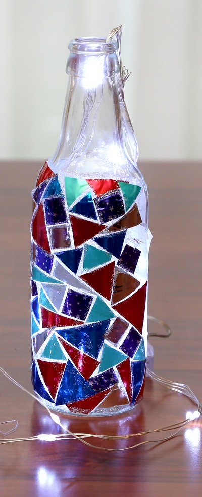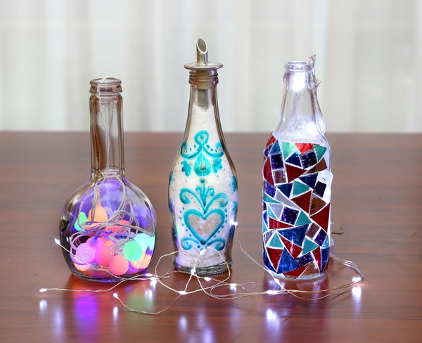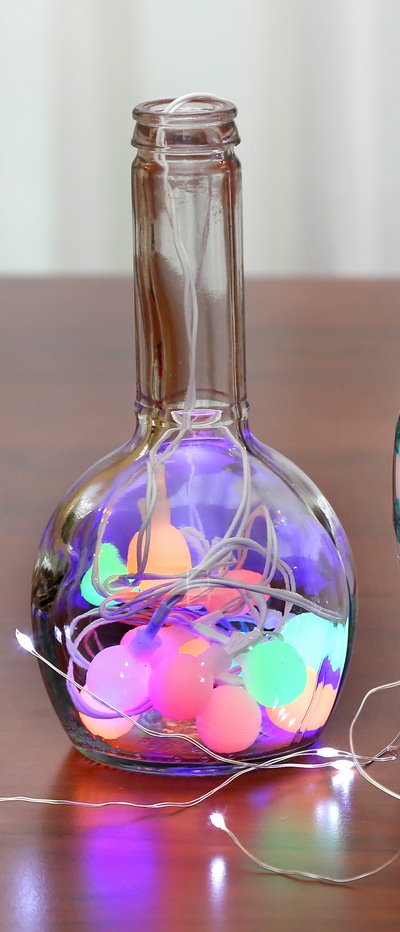 1. Do nedekorované čisté, ale suché lahve vložte barevná světýlka a hned máte romantickou lampičku.