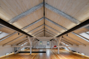 Schodiště při boční stěně galerie vede do mezaninové části, která se otevírá do krovu. „Původní konstrukce krovu byla očištěna a ponechána přiznaná, což umožňuje návštěvníkům vnímat prostor v jeho plné výšce a surovosti,“ vysvětluje Merta. Mezanin pak slouží jako druhá výstavní úroveň, ale také jako klidnější zóna při kulturních událostech.