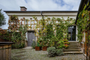 Z ústředního sálu je přímý vstup na dvůr, který propojuje všechny části areálu. Díky žulovému dláždění a fasádám popnutými révou tvoří klidný venkovní prostor, který funguje jako přirozené prodloužení interiéru. Z tohoto prostoru je možné sejít na zahradu s terasou orientovanou do klidové části pozemku, která v letních měsících slouží jako venkovní sezení pro návštěvníky galerie i soukromý prostor rodiny.