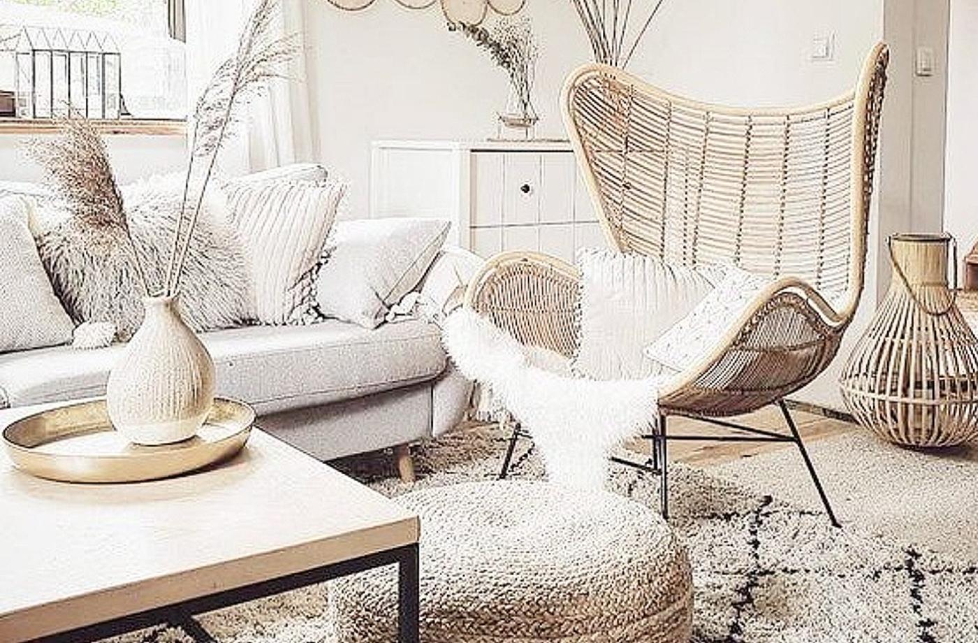 Na zem položte tlusté koberce s marockým motivem, kožešiny nebo kůže, na ně nandejte sedací polštáře, taburety a pletené puffíky. Přes sedačku přehoďte deky z recyklované vlny, a vystelte ji mnoha měkkými polštáři. Prázdnou stěnu za gaučem ozdobte dekoracemi v přírodním stylu, přidejte dřevo nebo macramé. Na parapet nandejte množství různých keramických, jutových a z mořské trávy pletených květináčů nebo dřevěných svícnů a lucerniček.