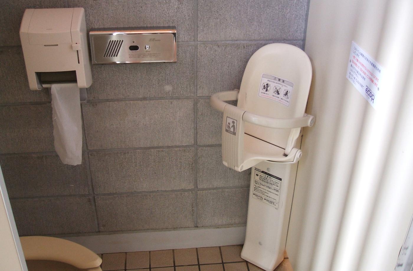 A to ještě není vše. Ve výši očí, tak aby na ně maminka pěkně viděla, bylo sedátko pro batolata. Maminka má děťátko pěkně na očích a nemusí řešit nám všem matkám dobře znýmý problém Kam s ním?! Mám ho nechat venku, přivřít dveře kabinky, posadit na zem, nechat v kočárku… Tohle maminky, alespoň ty japonské z ostrova Hokkaido, neřeší.