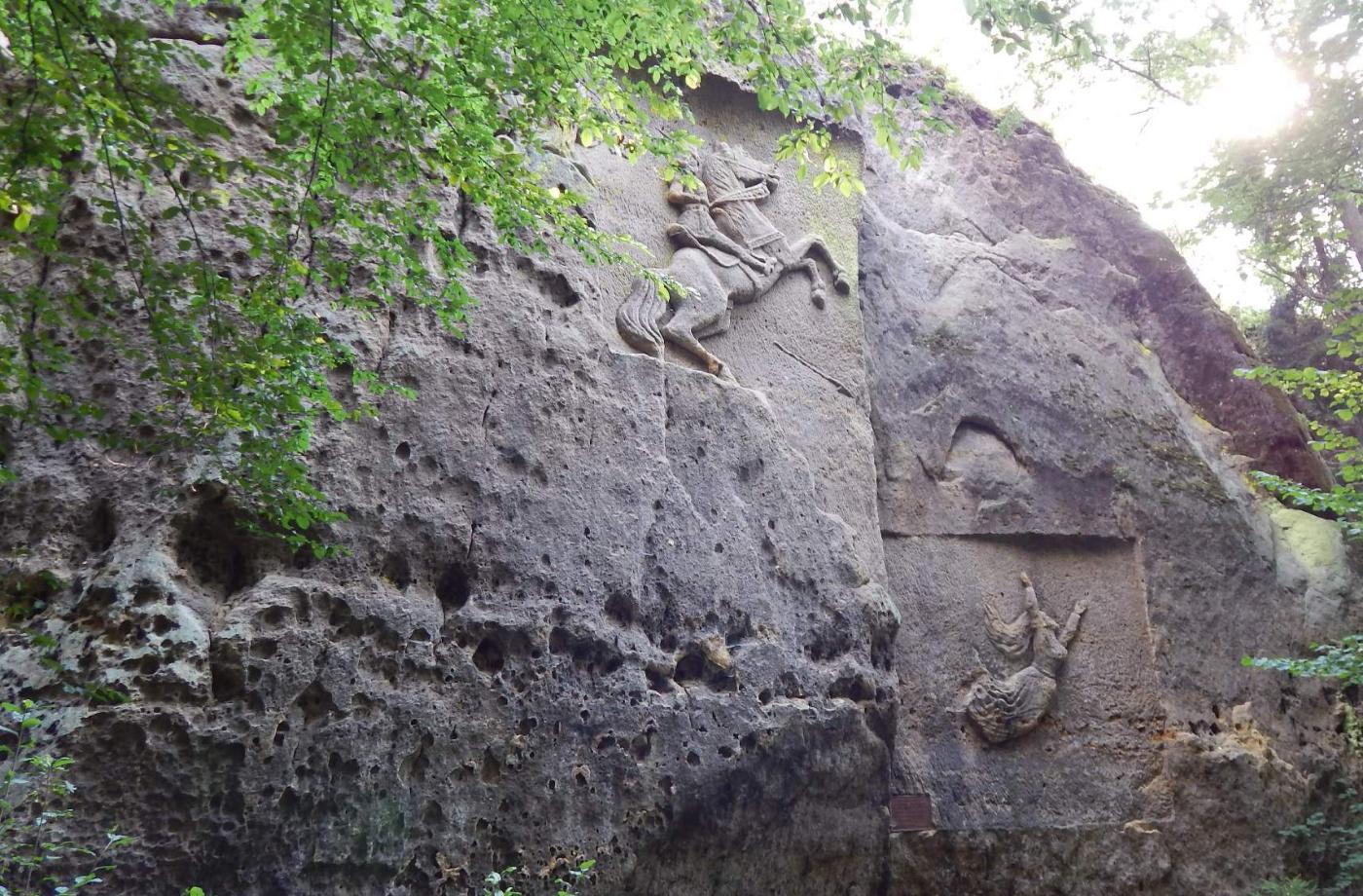 Skála se nachází blízko říčky Svitávka poblíž osady dříve zvaná Mlynářská díra – Müllerloch. Říkávalo se tomu také Kunratické Švýcarsko. Místo je vzdáleno zhruba 1,5 km jižně od Kunratic u Cvikova. V roce 1910 do 15 metrů vysoké skály vytesali místní občané Karl Beckert (nadučitel ve výslužbě) a Karl Bundesmann (četnický strážmistr ve výslužbě) reliéf rytíře na koni a padající dívky, který navazoval na zachovalou pověst. Mimo této skály, přezdívané Rytířský skok, byli autory i dalších reliéfů u nedaleké studánky (již neexistuje) a na Dutém kameni u Cvikova. Ke skále vede poblíž zelená turistická značka.