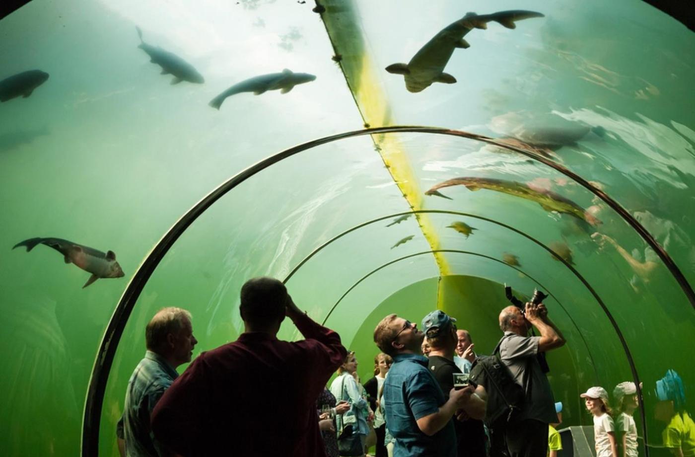 Jedná se o největší sladkovodní tunel v přírodě v Evropě, najdete jej poblíž Velehradu. Po levé straně uvidíte život ve velké tůni, po pravici a pod sebou život v rybníce se sumci, vyzami, kapry, líny, candáty, atd. V tomto patře rovněž prosklenou stěnou je možné nahlédnout na život v mokřadu, kde budou k vidění např. želvy bahenní, žáby, čolci, apod. Na stěnách jsou pro zrakově handicapované návštěvníky umístněny makety ryb v životní velikosti s popisem v Braillově písmu.