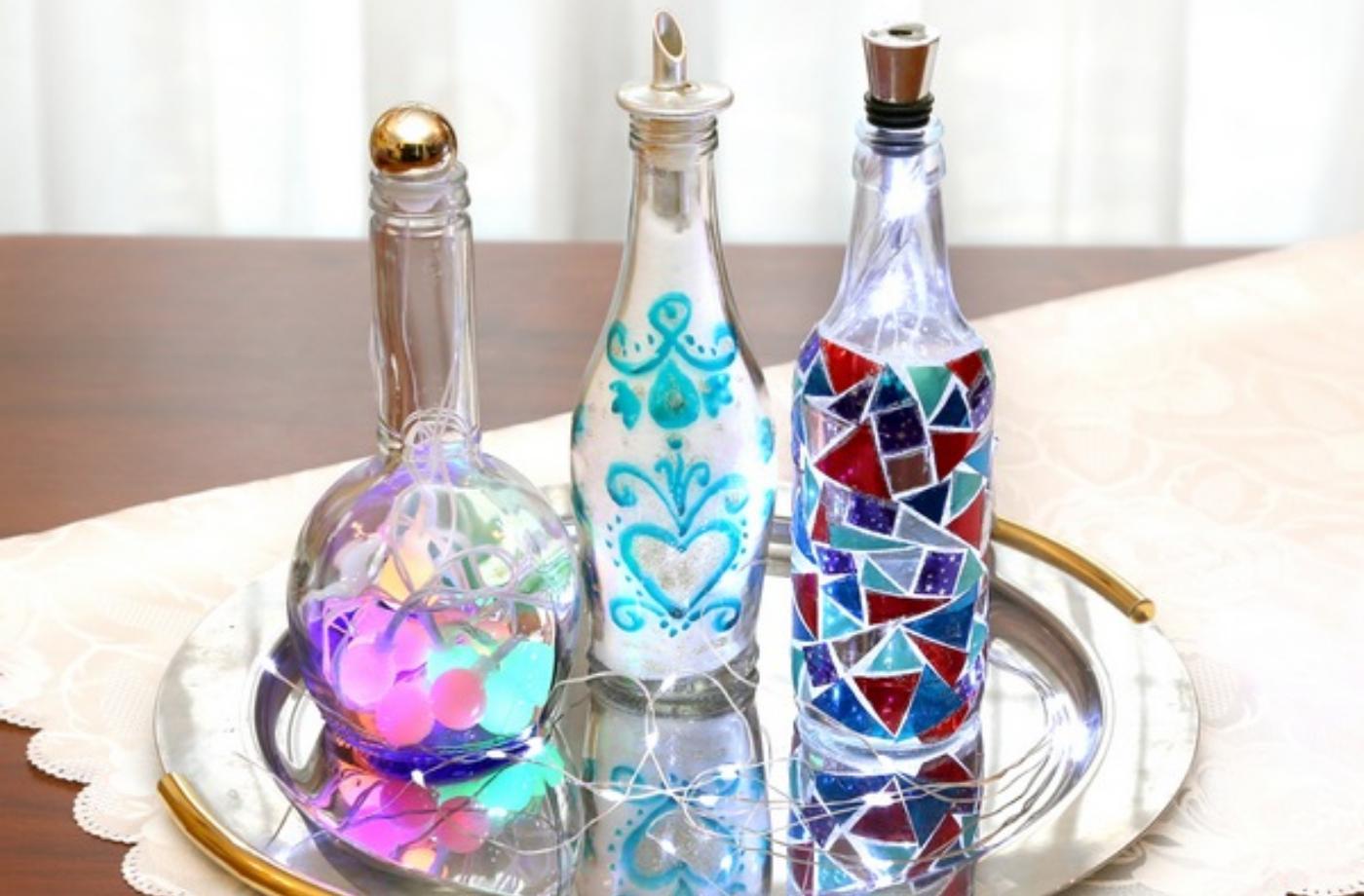 1. Do nedekorované čisté, ale suché lahve vložte barevná světýlka a hned máte romantickou lampičku.