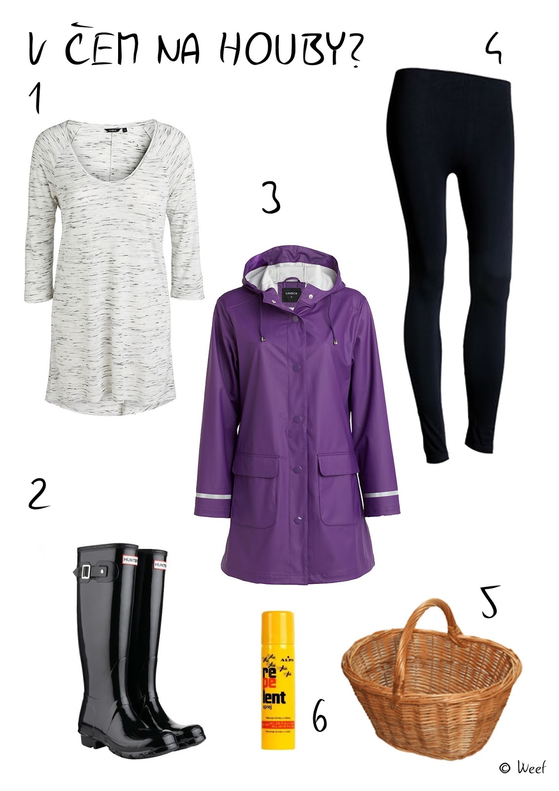 Nezbytností je pršiplášť (klidně nějaký krásně barevný), holiny a legíny, pod které se vám nedostane hmyz ani jehličí. Přesto nezapomeňte na repelent a hlavně na košík a rybičku 🙂