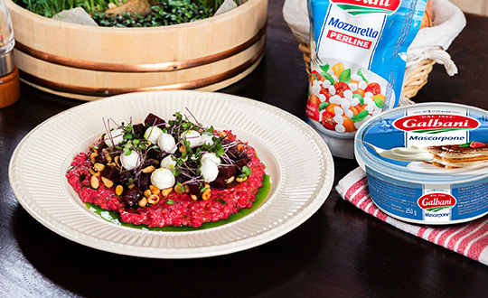 - Na závěr přidáme pyré z řepy, mascarpone, nastrouhaný parmezán a olivový olej.