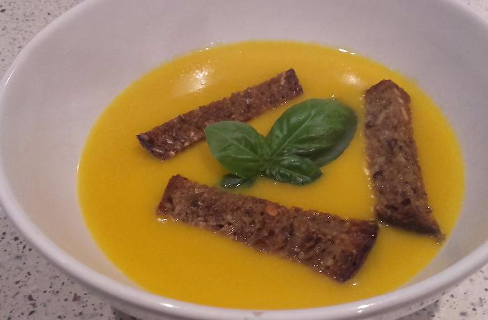 Svaříme pomerančovou šťávu s medem a kořením. Scedíme a v mixéru rozmixujeme dýni, znovu zahřejeme a přidáme pomerančový likér....