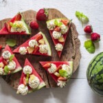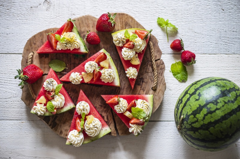 - S tímhle receptem se můžete vyřádit podle libosti a zdobit ho různými dobrotami. Plátek melounu nakrájejte na trojúhelníčky. Bílou čokoládu nechte rozpustit ve vodní lázni a prošlehejte ji s mascarpone. Krém dejte do sáčku se zdobicí špičkou. Meloun pokapejte limetkovou šťávou. Poté ozdobte krémem a přidejte ovoce. Podávejte vychlazené.