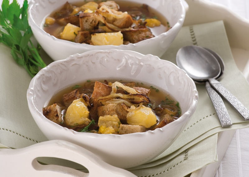 - Na sádle opečeme na silnější kolečka pokrájenou cibuli, zalijeme vývarem a chvíli povaříme, aby změkla. Polévku opepříme, případně podle chuti ještě dosolíme. Do ohnivzdorných misek rozdělíme porce chleba, který jsme nakrájeli na kostičky a osmažili na sádle. Posypeme ho na malé kousky nakrájenými tvarůžky, zalijeme polévkou, a to všechno v předehřáté troubě prudce zapečeme.