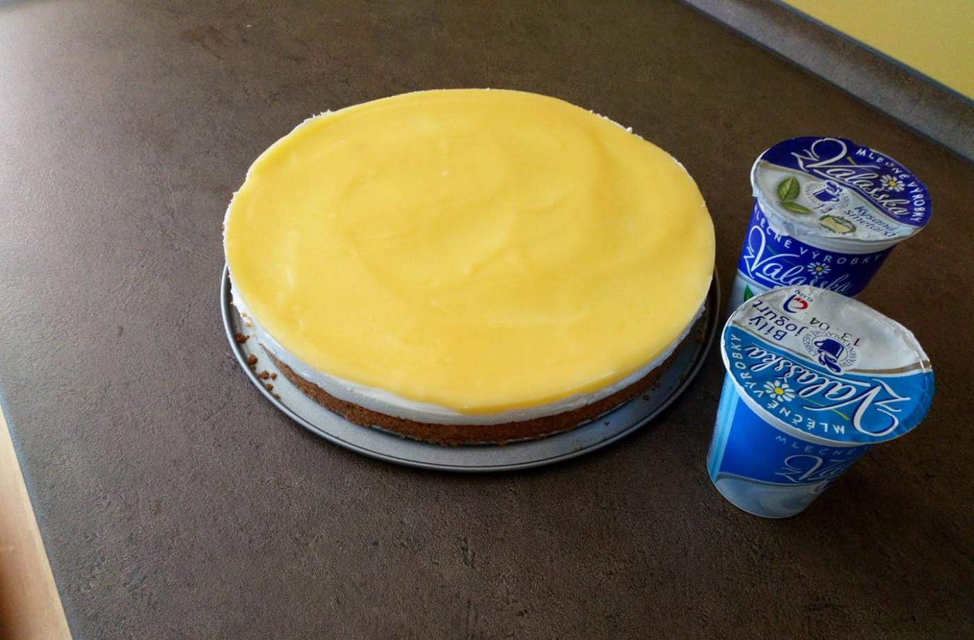 100 ml citronové šťávyVšechny suroviny, kromě másla, smícháme v hrnci se silnějším dnem. Na mírném plamenu směs za stálého míchání metličkou zahříváme zhruba 2 minuty. Hrnec sejmeme z plotny a přidáme nakrájené máslo, které do směsi přimícháme. Opět postavíme na plotnu a vaříme za stálého míchání ještě asi 3 minuty, až dostaneme konzistenci pudinku. Polevu rozetřeme na dort a necháme ztuhnout minimálně 2 hodiny, ale lepší do druhé dne. 2ks - Máslové sušenky100g - Máslo 1ks - Smetana1ks - Měkký tvaroh1ks - Bílý jogurt1ks - Zakysaná smetana3lžíce - Cukr moučka 1ks - Ztužovač na nepečené dorty1ks - Citrony příprava - 60vaření - 60