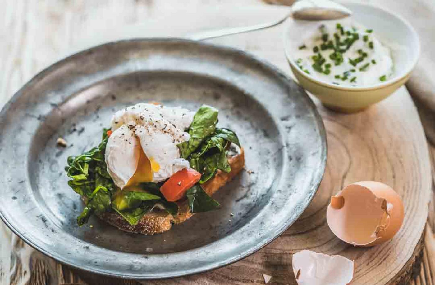 2krajíc - oblíbený chléb 2ks - vejce80g - žervé4-6ks - plátky slaniny2hrst - očištěné špenátové listy1/2hrst - nasekaná pažitka1ks - rajče1/2lžíce - olivový olej1lžíce - máslo500ml - voda5lžíce - ocetks - sůl, pepř příprava - 20vaření - 0