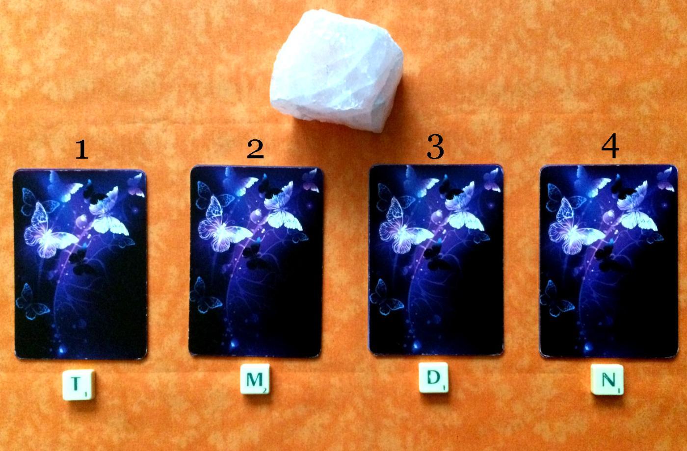 Celý výklad zastřešuje neopracovaný růženín; kámen lásky. Písmenka mohou pomoci s výběrem toho správného balíčku. Oranžová barva je barvou vztahů, druhého energetického centra emocí, sexuality a kreativity (pánevní oblast).