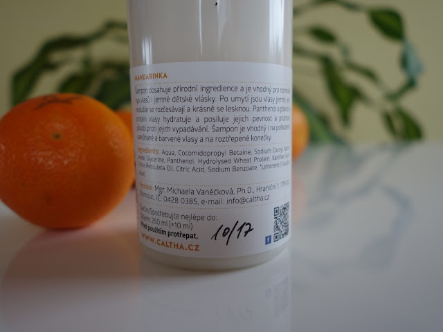 Šampon s esenciálním olejem z mandarinky obsahuje pouze přírodní ingredience (více na obrázku níže). Je určen na vlasy normální, ale i poškozené a namáhané, především na ty dlouhé. To jsem ocenila, protože vlasy po něm byly jemné a krásně se rozčesávaly. A hlavně, po použití šamponu jsem nepotřebovala žádný kondicionér!!! Bez kondicionéru si totiž mytí svých dlouhých vlasů nedovedu představit, protože bych si při rozčesávání vytrhala spoustu vlasů.