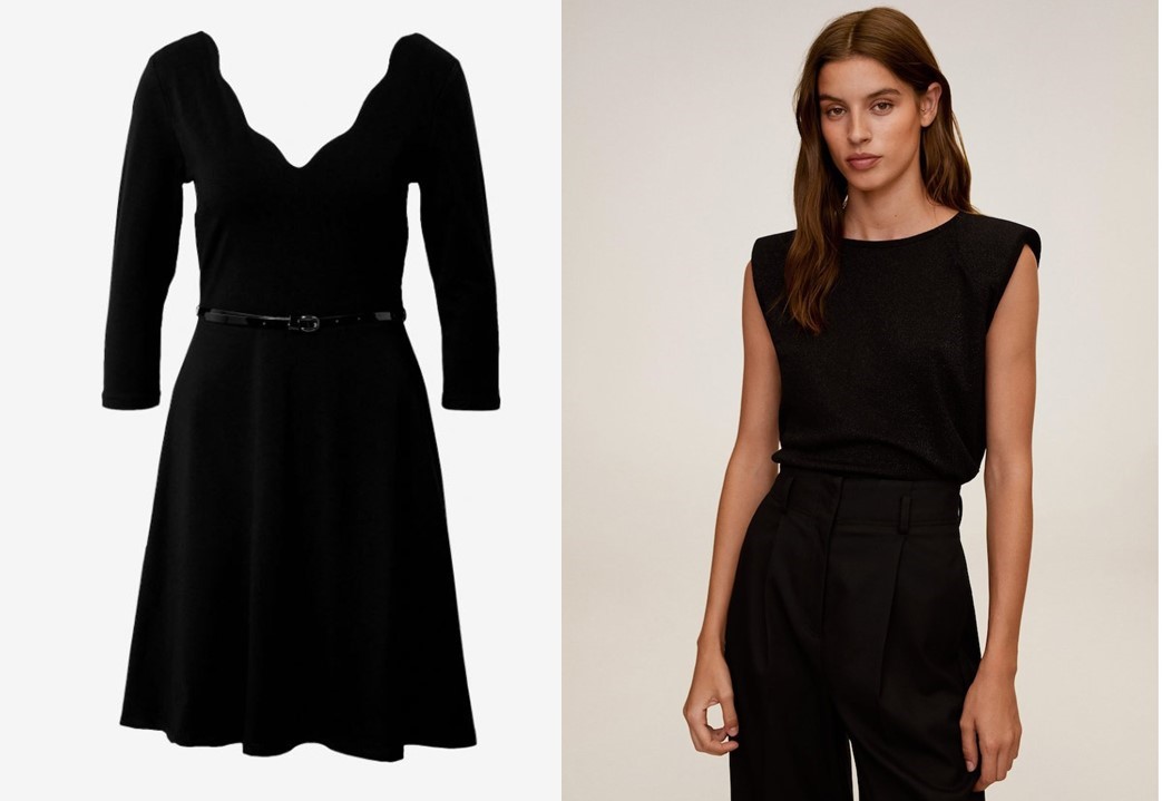 1. Černé šaty Insa 1299 Kč, About you; 2. Černý svetrový top s ramenními vycpávkami Mango Show, 599 Kč, Zoot