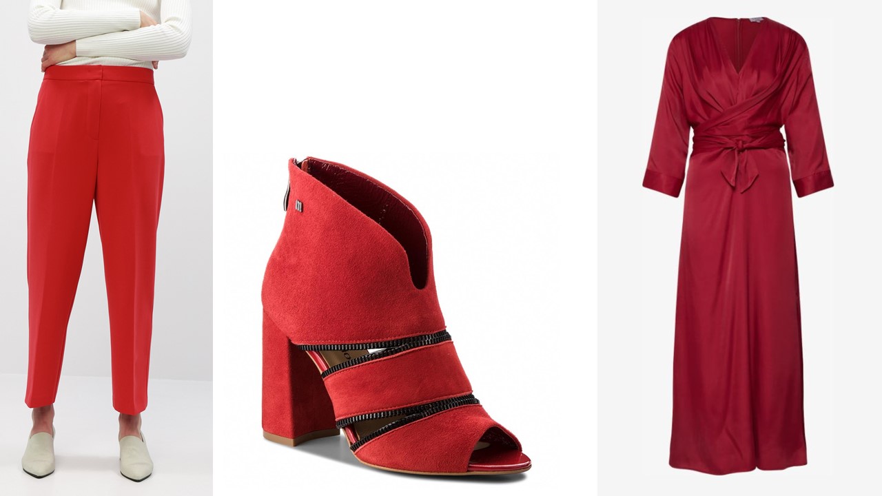 1. Červené dámské kalhoty Tommy Hilfiger, 2799 Kč Zoot; 2. Sandály Maccioni, 1244 Kč, Eobuv; 3. Šaty Victoria LeGer, 1499 Kč, About you
