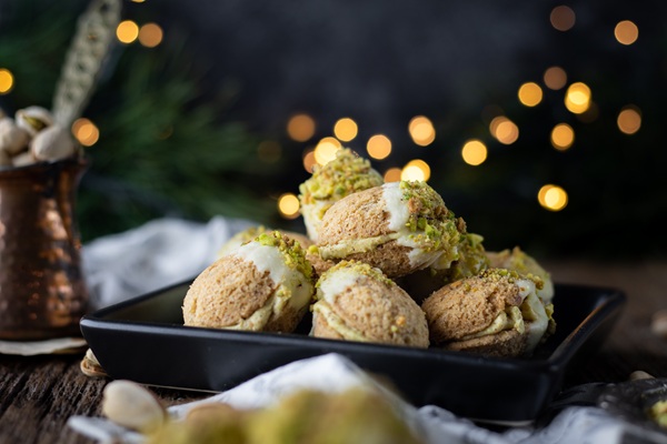 Máslo vyšlehejte do pěny. Přidejte najemno mleté pistácie, špetku soli a dvě lžíce Salka. Vyšlehejte do hladkého, jemného krému. Na jednu skořápku naneste trochu krému a přiklopte druhou. Lehce přimáčkněte, aby se spojily.