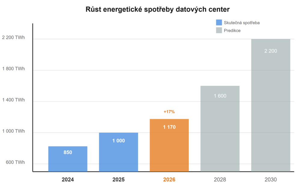 Dostupnost elektrické energie se posunula na první místo mezi faktory určujícími, kde vzniknou nová datová centra. Umělá inteligence spotřebovala v roce 2025 přibližně 3 % světové elektřiny a podle S&P Global poroste spotřeba v roce 2026 o dalších 17 %. Do roku 2030 by datová centra mohla spotřebovávat přes 2 200 TWh ročně – což odpovídá dnešní spotřebě celé Indie.