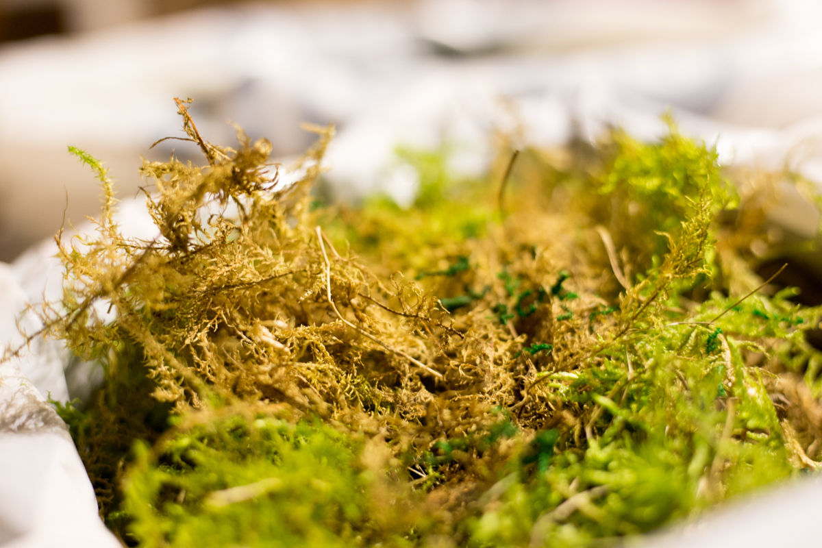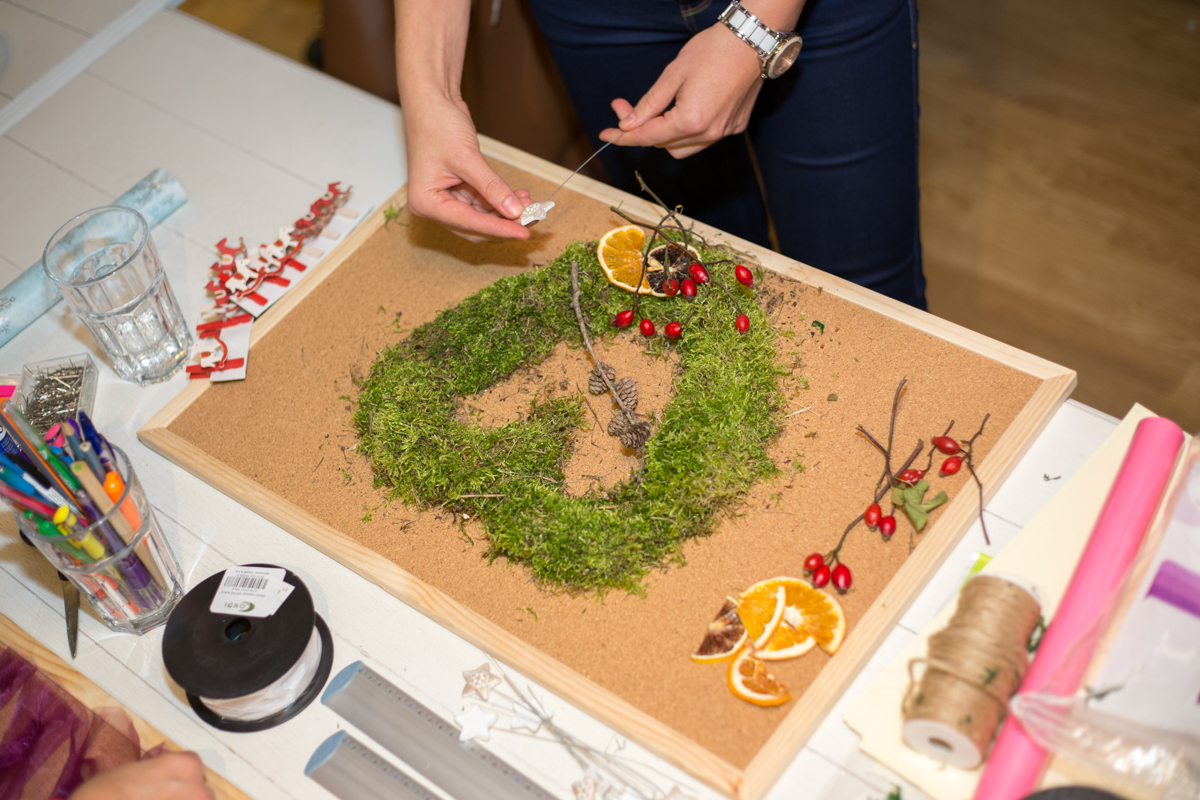 Co obnášela příprava? Výlet do lesa. Poctivě jsme nasbíraly veškeré lesní bohatství – šišky, bukvice, šípky, větvičky a hlavně mech. Při jeho vysychání se můj obývák proměnil v lesní mýtinu provoněnou sušenými pomeranči a citróny, které můžete dát jako já do sušičky nebo jen na topení. Mašle, ozdůbky, korkové nástěnky, pírka a všelijaké dekorace měla na starosti Mibiko. Kombinace obyčejného, přírodního a trocha pozlátky vytvoří dokonalé dílo.